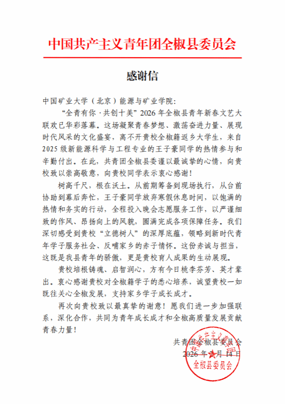 本网讯 近日,中国共产主义青年团全椒县委员会给我院发来感谢信,感谢我院为青年成长成才做出的贡献,并对能源与矿业学院2025级新能源科学与工程专业学生的服务工作给予充分肯定。