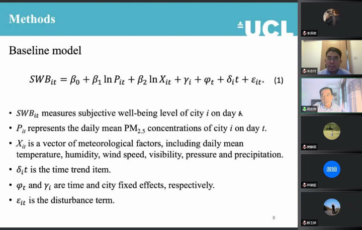 米志付教授的报告围绕我国居民的主观幸福感与空气污染物浓度的关系展开。运用情感分析法,他构建了基于百度搜索词的主观幸福感指数,利用京津冀13个城市从2014年8月到2019年12月的日度数据,建立了量化主观幸福感与PM2.5浓度和气象因子矢量(包含日平均温度、湿度、风速、能见度、气压和降水)关系的固定效应模型。其结果表明,主观幸福感与空气污染物的浓度呈负相关关系,这种负相关关系在炎热的夏天表现得更为明显,此外,位于更富裕城市的居民对于空气污染物更为敏感。报告后,与会师生与米志付进行了深入探讨,并纷纷表示受益良多。