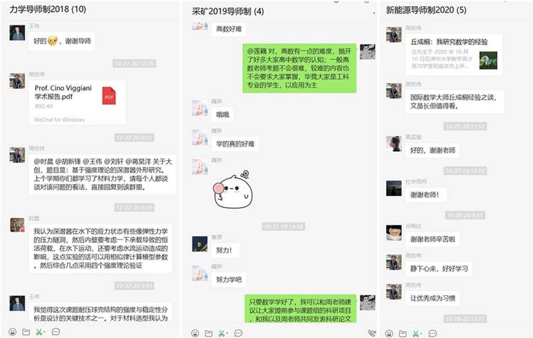 从本科生新生入校分配导师以来,指导导师团队就与学生建立“导师制”微信群作为及时交流渠道,平时在生活上、学习上一直保持着与他们的密切交流。比如针对本科生新生刚踏入大学校园,对新环境、新生活充满好奇,容易受到周围一些形形色色的诱惑干扰,难免上当受骗,造成个人损失,导师团队就向各位新生推送了“校园贷”等警示片,提醒大家拒绝、远离诱惑,增强安全防范意识。将力学、采矿专业知识的学习和人文素养的培育联系起来,叮嘱学生一定要养成良好的读书习惯,陶冶情操,内外兼修,成贤成材。
