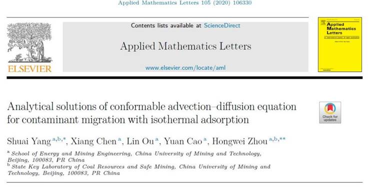 Shuai Yang*, Xiang Chen, Lin Ou, Yuan Cao, Hongwei Zhou*. Analytical solutions of conformable advection-diffusion equation for contaminant migration with isothermal adsorption. Applied Mathematics Letters, 105(2020), 106330, doi: 10.1016/j.aml.2020.106330 (SCI收录, Q1, Top, IF=3.848).