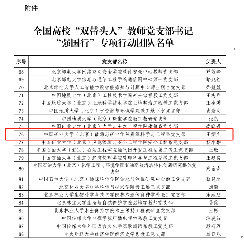 本网讯 近日,全国高校和北京高校“双带头人”教师党支部书记“强国行”专项行动团队名单公布,能源与矿业学院资源科学与工程系党支部入选全国高校“双带头人”教师党支部书记“强国行”专项行动团队。