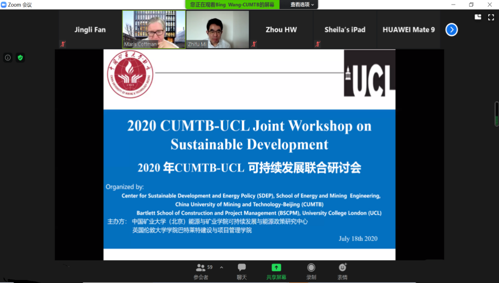 7月18日,我院和英国伦敦大学学院(UCL)巴特莱特建设与项目管理学院共同主办,我院可持续发展与能源政策研究中心承办的“2020年CUMTB-UCL可持续发展联合研讨会”在ZOOM线上平台举行。参加本次联合研讨会的有英国伦敦大学学院巴特莱特建设与项目管理学院院长Maris Coffman教授、米志付副教授,学院院长周宏伟教授、侯运炳教授等,以及来自伦敦大学学院、清华大学等国内外院校的60余名研究人员参加了此次学术研讨会。本次会议由樊静丽教授主持。