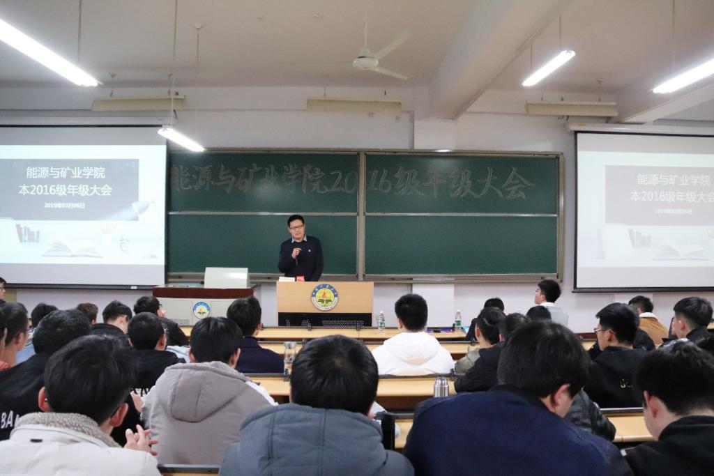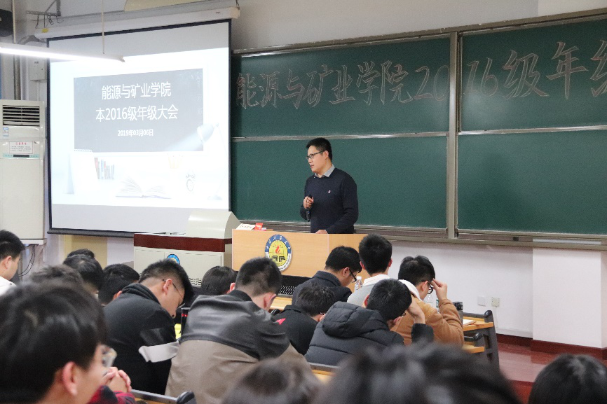 为帮助同学们科学规划,合理选择,2019年3月6日下午,能源与矿业学院在教学楼112召开本16级年级大会,就大三同学目前面临的诸多形势和选择,进行深入的分析和交流。能源与矿业学院党委书记杨大鹏、研究生辅导员马亚格、本16级辅导员罗茗以及16级全体本科生参加了会议。会议由罗茗主持。