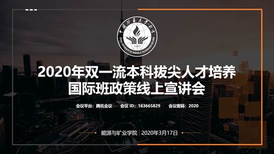 3月17日下午,我院通过腾讯会议召开了2020年双一流本科拔尖人才培养国际班政策线上宣讲会。院长周宏伟,副院长刘洪涛、杨胜利以及其他相关负责老师,本17级、18级学生参加了此次会议,会议由院党委书记杨大鹏主持。