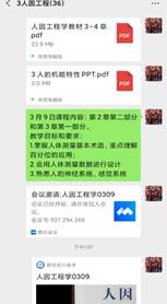 由于开课时间比较晚(第3周),前期可以做比较详细的准备工作,在比较了多个网络教学平台后,为避免卡顿、网络拥堵等不稳定现象,确定了以“腾讯会议”为教学平台。上课用的教材扫描后提前1周、上课PPT提前1天发至授课微信群,供学生自学。课堂直播上课,对于一些需要板书的地方,通过切换共享屏幕的方式,利用手写板实现板书的功能;另外,“腾讯会议”提供了可以讨论的平台,针对一些案例和问题可以采取类似课堂提问的方式进行讨论。“人因工程学”是一门多领域交叉的应用学科,案例比较多,无法在课堂上讨论和分享的案例会发送至微信群,加深学生对运用的理解。