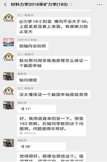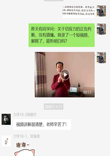与各位老师交流一下我的《材料力学》课程在非常时期组织教学的做法:(1)组建了一个微信群,160个学生一个不少全部入群,并且还邀请了分管本科教学的副院长、助教、辅导员、教秘、督导老师入群;(2)提前把教材、教案的pdf发给了大家,并且制作了慕课,这样至少有三个资料可供学生学习;(3)课前给学生提出趣味思考题,激发学生的学习兴趣(4)准时开讲,需要两个屏幕,一个显示教案、一个显示教材。用微信语音讲课,每次语音不超过60秒。不卡不顿,如行云流水,学生有临场感;(5)严格按照课表组织教学,并且有专门的考勤软件来考勤;(6)随时在微信群中用图片的形式提问与学生互动,增强学生临场感,保障授课效果;(7)下周布置课后作业,课后作业要求学生手写完成,并拍照发给助教批改并记录。