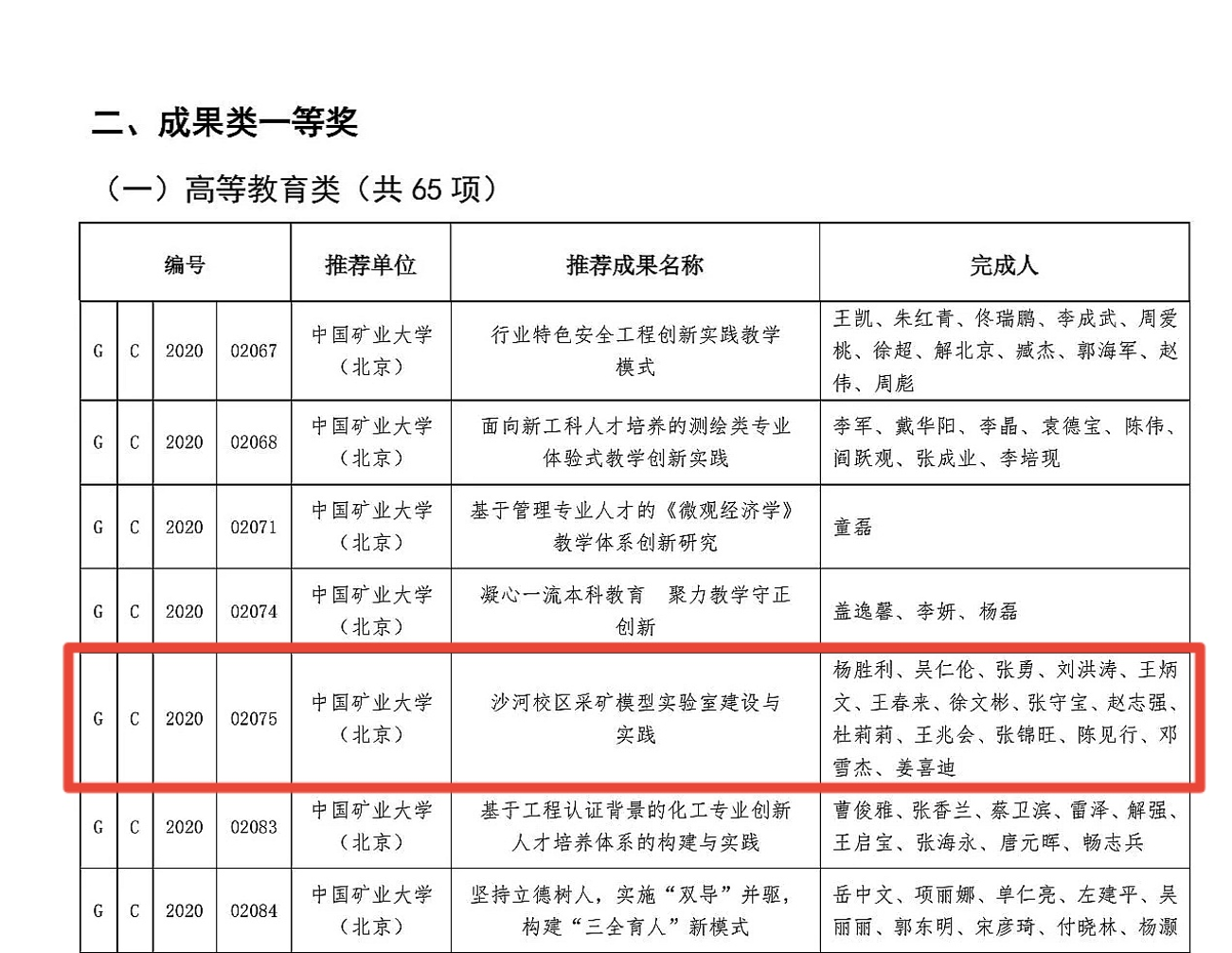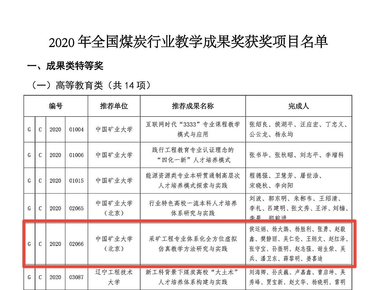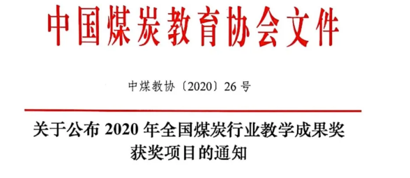 日前,中国煤炭教育协会公布了2020年全国煤炭行业教学成果奖获奖项目名单,我院选送的教学成果在众多成果中脱颖而出,斩获特等奖一项、一等奖一项。