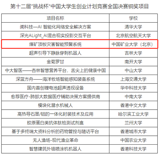 第十二届“挑战杯”中国大学生创业计划竞赛聚焦创新、协调、绿色、开放、共享五大发展理念和2020年决战脱贫攻坚、决胜全面小康的目标,共设置了“科技创新和未来产业”“乡村振兴和脱贫攻坚”“城市治理和社会服务”“生态环保和可持续发展”“文化创意和区域合作” 五个组别,吸引了全国2786所高校的92.4万名大学生报名参赛,17.91万个项目共同角逐,共1400支学生团队晋级决赛。我院共有15个项目报名参赛,经过多轮培育、打磨和层层筛选,最终,“煤矿顶板灾害智能预警系统”项目获北京市金奖,并顺利晋级国赛获国家级铜奖,“乡桥” “新型矿山‘智慧水泥’” “盖伦科技-雷达探地与数据分析领军企业”三个项目获北京市银奖。