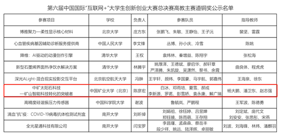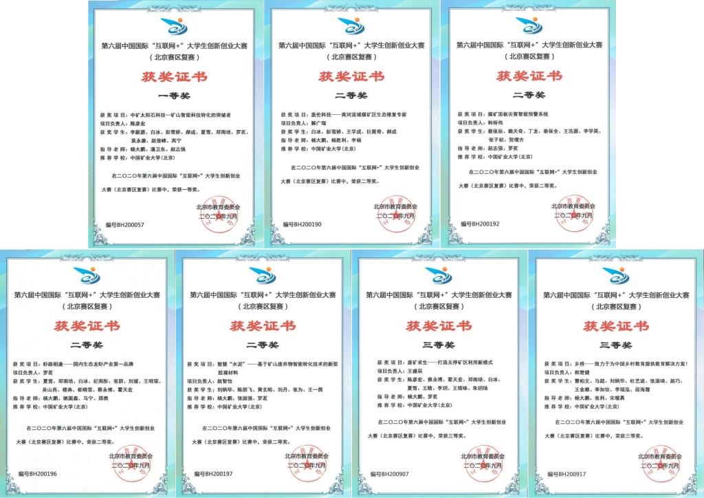 2020年,学院共有160余名学生共计15项作品参加“互联网+”大赛,其中5项作品为学科创新项目成功转化大学生创新项目。在教务处、学工处、校团委的指导和帮助下,经过5个月的持续培育、打磨和筛选,最终,“中矿太阳石科技--矿山智能科技转化的突破者”项目获北京市一等奖,并成功晋级国赛获国家级铜奖,“盖伦科技--黄河流域煤矿区生态修复专家” “煤矿顶板灾害智能预警系统” “虾路相逢--国内生态龙虾产业第一品牌” “智慧“水泥”--基于矿山废弃物智能转化技术的新型胶凝材料”4个项目获北京市二等奖,“废矿求生--打造关停矿区利用新模式” “乡桥--致力于为中国乡村教育提供教育解决方案”2个项目获北京市三等奖。截至目前,我院学生在“互联网+”大赛中已获国家级铜奖1项,北京市一等奖1项,北京市二等奖5项,北京市三等奖17项。
