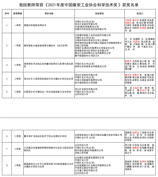 近日,中国煤炭工业协会发布了《关于公布表彰2021年度中国煤炭工业协会科学技术奖获奖项目和个人的决定》名单,我院教师获得各级奖项共计8项,其中一等奖2项,二等奖6项。