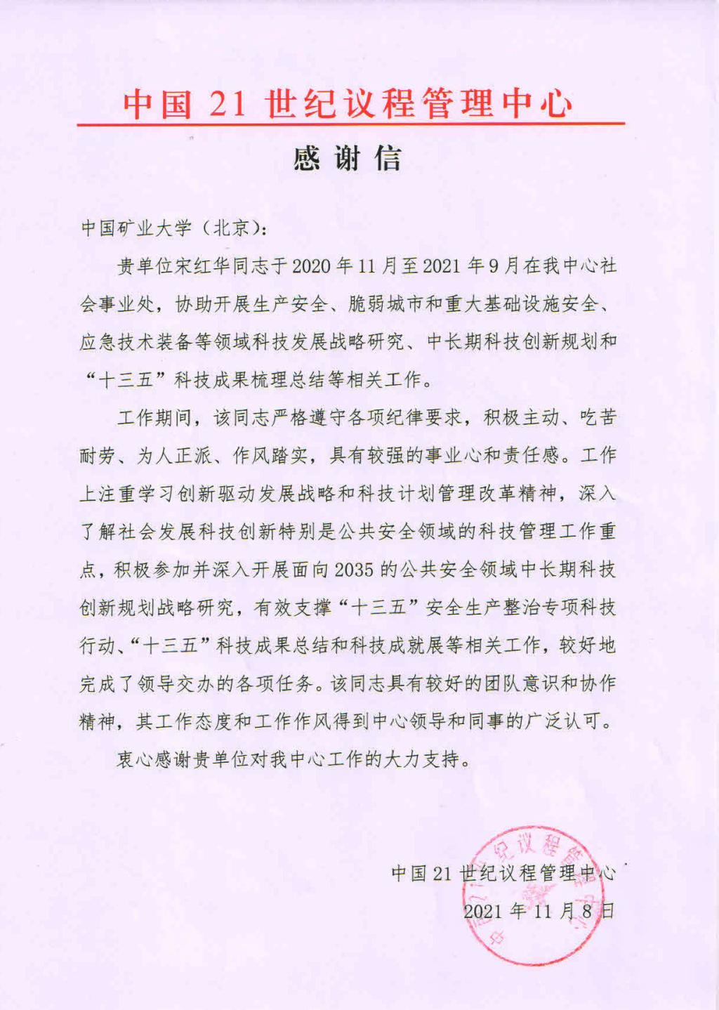 2020年11月-2021年9月,宋红华同志在该中心社会事业处协助开展公共安全领域重点研发计划科技专项项目战略研究、日常管理、科技成果梳理等工作,积极主动、吃苦耐劳、作风踏实,获得了中国21世纪议程管理中心领导和同事的广泛认可。