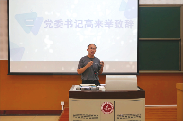 学院党委书记高来举叮嘱各位新生,当代大学生在做好专业研究的同时,也要深刻认识到意识形态工作的重要性,注重思想政治学习,关注国家大政方针、政策走向,牢牢掌握马克思主义哲学科学的世界观和方法论,以此为理论指导,不断精进自己的专业特长,培育和践行社会主义价值观,做一名遵纪守法、有理想、有道德、有文化、有纪律的新时代四有青年。