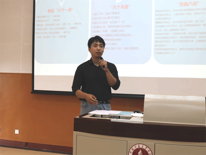 新生辅导员陈翔宇老师提醒大家初入大学校园一定要牢牢树立反诈意识,防范各类诈骗,一旦收到各类疑似欺诈信息,及时与辅导员老师沟通联系,擦亮双眼,保护个人生命财产安全。