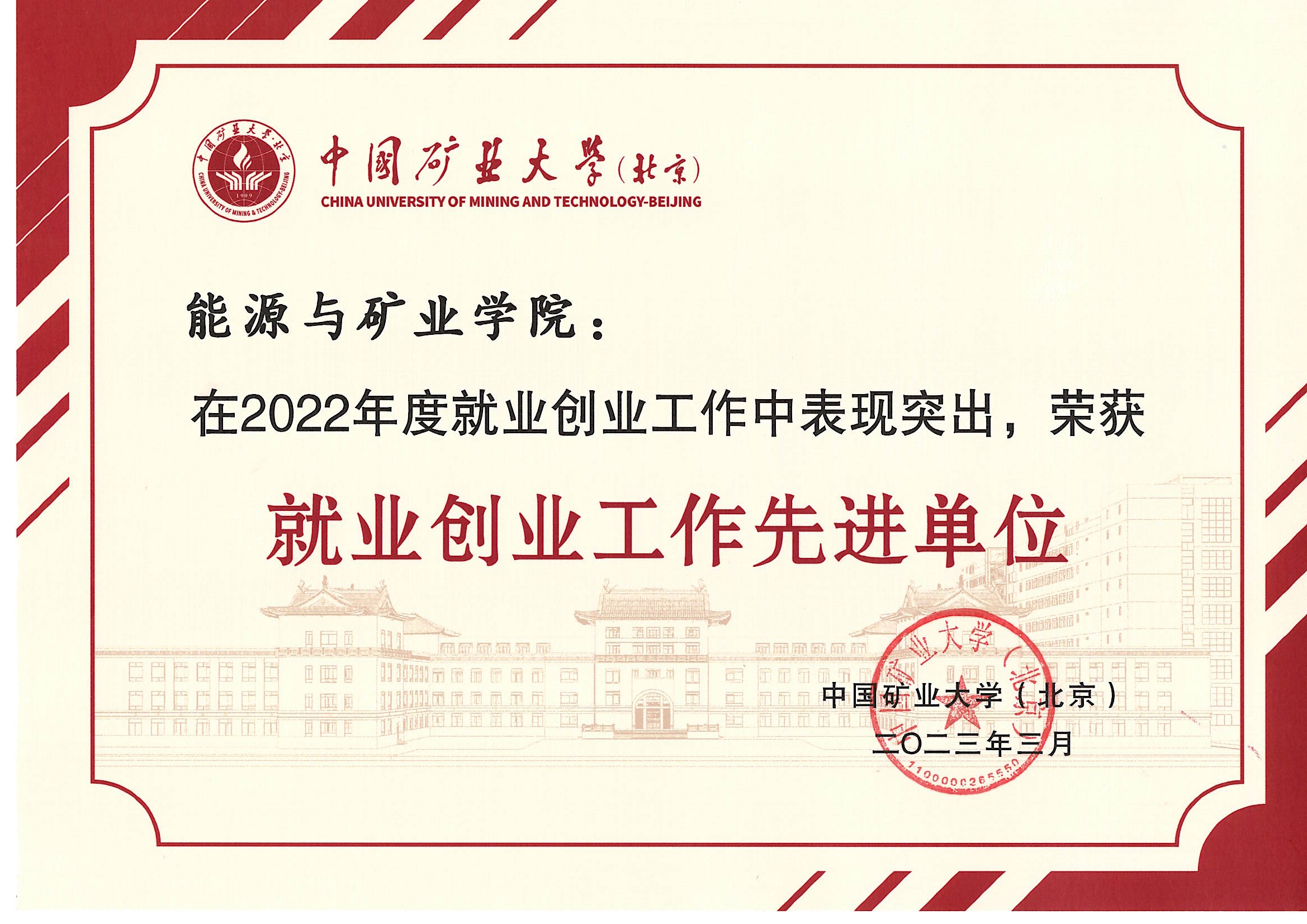 “就业创业工作先进单位”证书