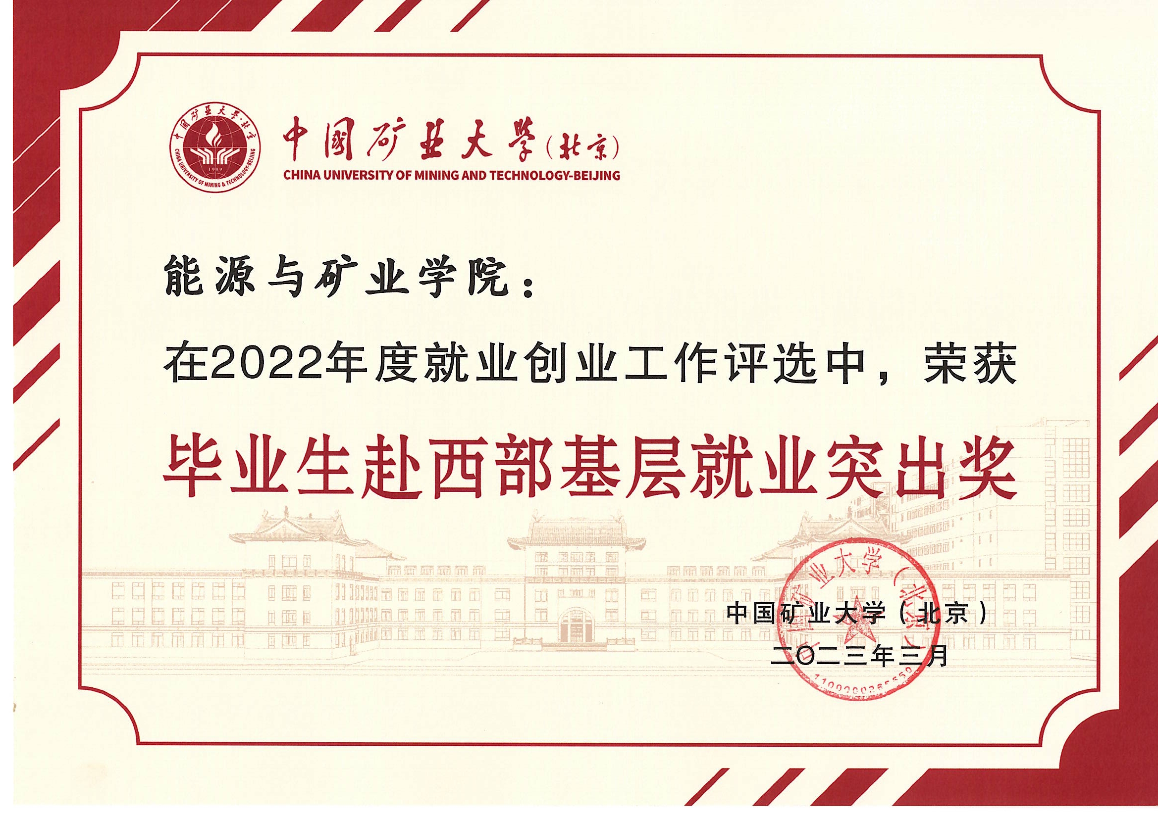“毕业生赴西部基层就业突出奖”证书