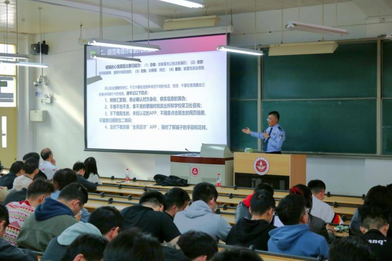 保卫处政治保卫科科长刘珊杉、学院团委书记马亚格,辅导员姚泽旭、宋海浪等出席活动,200余名在校学生参加讲座。