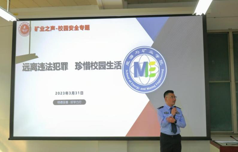 为提升大学生法纪意识,引导他们自觉远离法纪红线,3月31日下午,在保卫处大力支持下,能源与矿业学院在教学楼210举办“矿业之声”校园安全专题讲座,北京市公安局海淀分局内保支队警官刘烨应邀为学院路校区在校生做了题为“远离违法犯罪,珍惜校园生活”的专题讲座。学院党委书记高来举主持讲座。