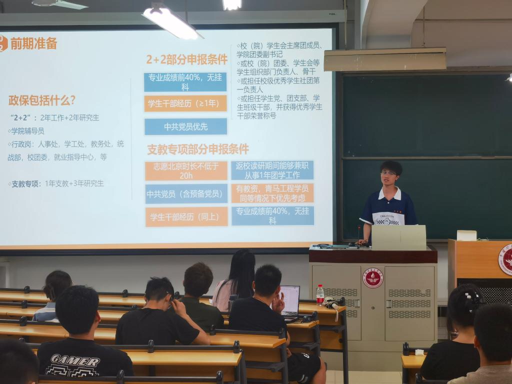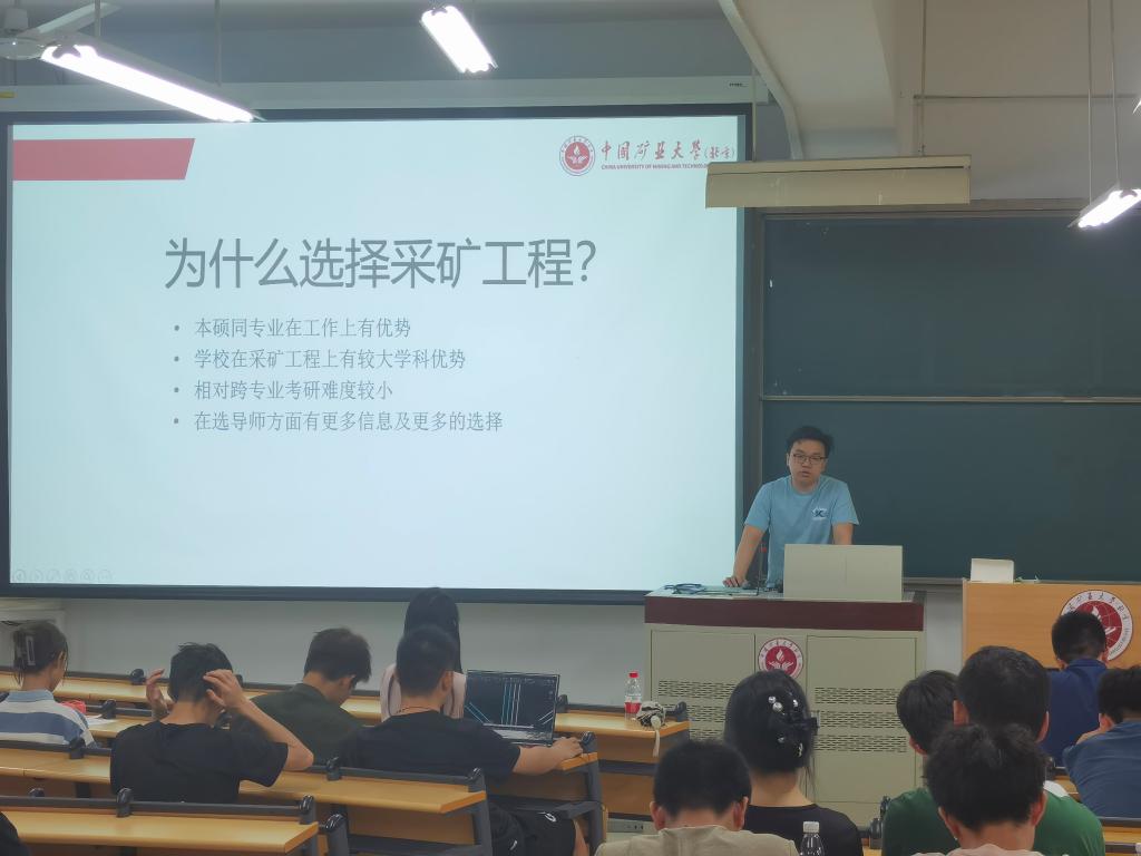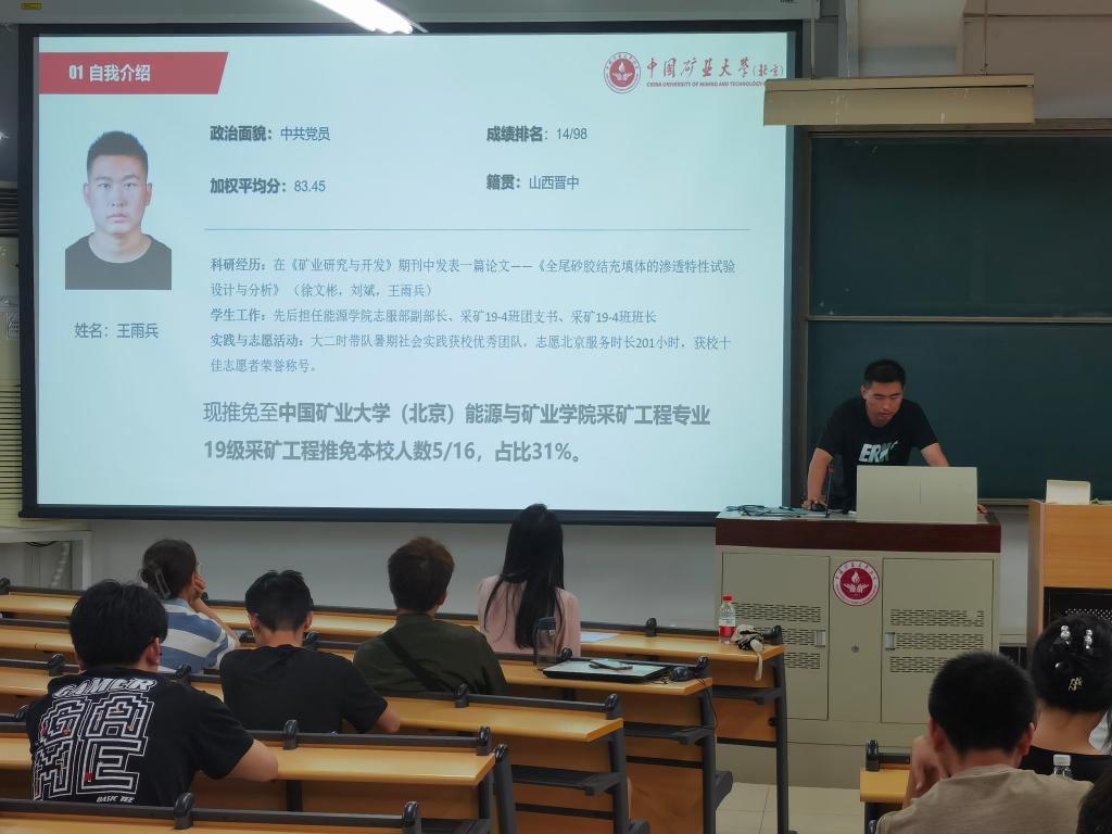 会上,9名学生代表针对保研、考研和求职,分享了各自的经验做法。推免至本校采矿工程专业的王雨兵,分享了自己对采矿专业的认识以及如何合理选择保研方案,并介绍了当下热门的采煤工艺。推免至浙江大学的温明睿,强调了参加保研夏令营的重要性,通过自身的经历分享了保研流程和注意事项。推免至北京航空航天大学的刘雨桐,介绍了保研面试相关问题,并强调一定要注意各院校夏令营的时间节点,合理选择。本校支教保研的谢雨杨,综合了“2+2”推免和支教保研的各项要求,向同学们详细讲解了两类保研的区别与联系。