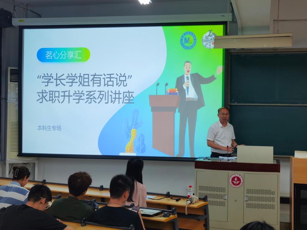 为助力我院大三学生更好地求职升学,科学设定求职升学目标,合理规划接下来的学习和生活,分享求职升学好的经验和做法。5月16日晚19点,由茗心工作室主办的茗心分享汇“学长学姐有话说”求职升学系列讲座本科生专场暨本2020级年级大会在学院路校区教学楼106顺利召开。本次会议邀请了本科2019级王雨兵、温明睿、谢雨杨、刘雨桐、崔博、赵阳、张耀太、张心怡、田乐9名优秀学生代表作专题分享。院党委书记高来举出席会议并讲话,研究生毕业年级辅导员、学院团委副书记、茗心工作室负责人罗茗,本19级辅导员姚泽旭、硕21级辅导员宋海浪、本20级辅导员夏雪、兼职教师彭雪娇,以及2020级全体本科生参加了会议。大会由夏雪主持。