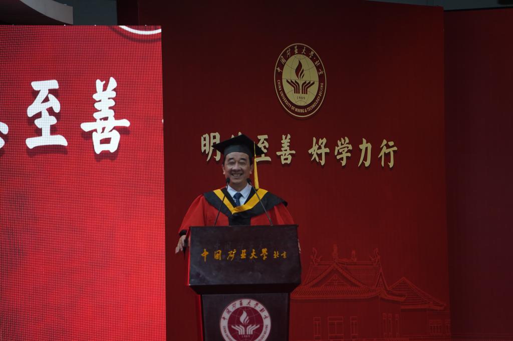 大会伊始,全体起立,奏唱中华人民共和国国歌。院长周宏伟致辞。他首先代表学院,向顺利毕业的同学们表示热烈的祝贺。本科四年、硕士三年、博士四年,疫情三年,虽然青春遇上疫情,但大家克服重重困难,保质保量完成任务,取得了学位。站在人生新的起点上,他对毕业生提出三点希望:一要有责任。一滴水,只有融入大江大河,才不会干涸。一个人,也只有将自己的前途命运融入国家民族,才不会迷失。一切从新开始,要脚踏实地,尽情挥洒如歌的青春岁月。二要有追求。有追求,就是选择了一种精神。中华民族的精神就是文化的传承,我们要传承好矿业文化,钱院士曾说“Everything begins with mining”,采矿强则国强。因此无论走到哪里,都要讲好我们自己的矿业文化故事。三要有快乐。我们生活在一个伟大的时代,要做精神的贵族,心怀美好,创造辉煌人生。