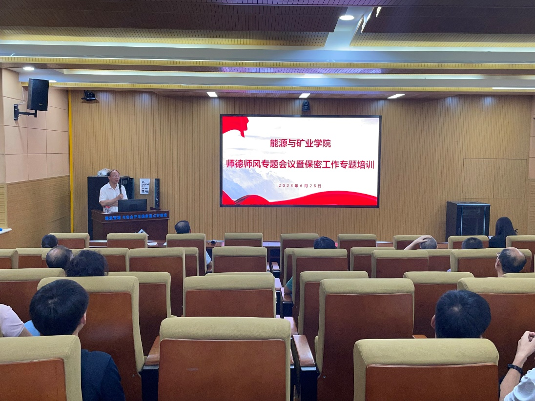 本网讯 6月26日下午,能源学院在民族楼234报告厅召开师德师风专题会议暨保密工作专题培训。院党委书记高来举,院长周宏伟,副院长杨胜利、樊静丽出席会议,学院全体教职员工参加会议。