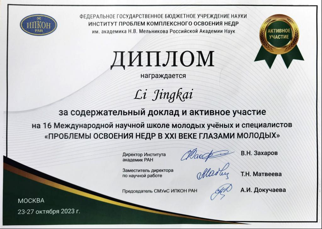 本届大会吸引了来自中国、俄罗斯、日本等国知名院士、专家与青年学者参会并作报告,其中共计121位青年学者进行了报告。李敬凯博士2022年12月受CSC公派赴俄罗斯进行联合培养,合作导师为莫斯科国立研究技术型大学教授、俄罗斯自然科学院、矿业科学院院士巴图金A.C教授。