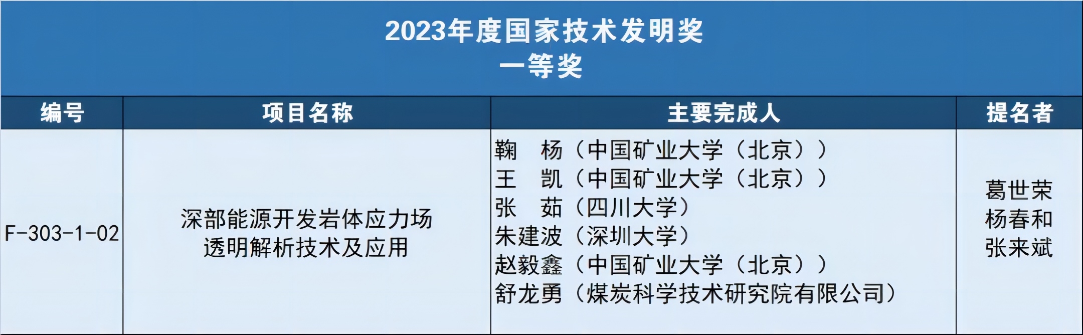 由中国工程院葛世荣、杨春和、张来斌三位院士提名,中国矿业大学(北京)作为第一完成单位,煤炭精细勘探与智能开发全国重点实验室、我院鞠杨教授作为第一完成人、我院赵毅鑫教授作为第五完成人、协同四川大学、深圳大学、煤炭科学技术研究院有限公司共同完成的成果“深部能源开发岩体应力场透明解析技术及应用”荣获2023年度国家技术发明奖一等奖。