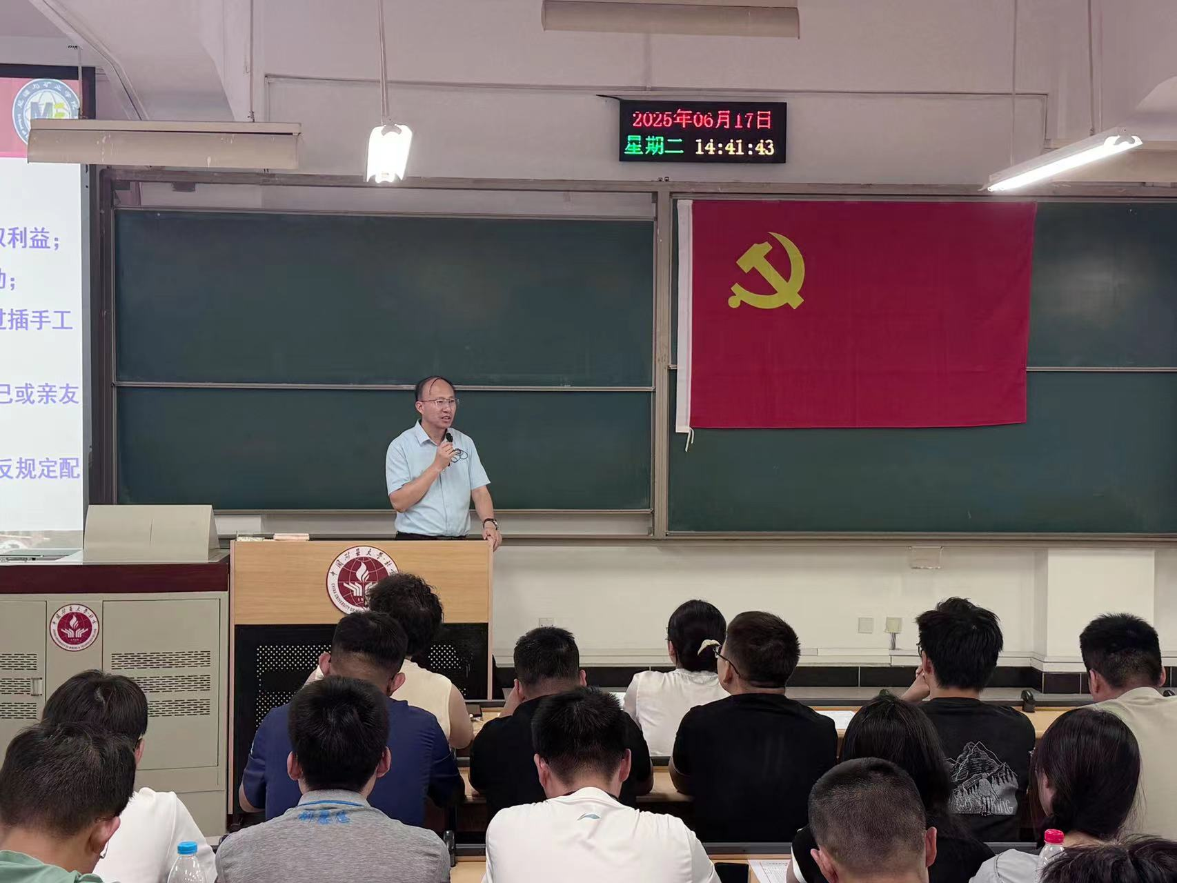 本网讯 为帮助2025届毕业生党员树立廉洁思维,培养和强化自我约束、自我控制的意识和能力,引导其树立正确的职业价值观,6月17日下午,学院党委书记高来举在教学楼106以“走好第一步、守住廉洁关”为主题,讲授廉洁教育专题党课,学院全体毕业年级及新发展的预备党员聆听党课。
