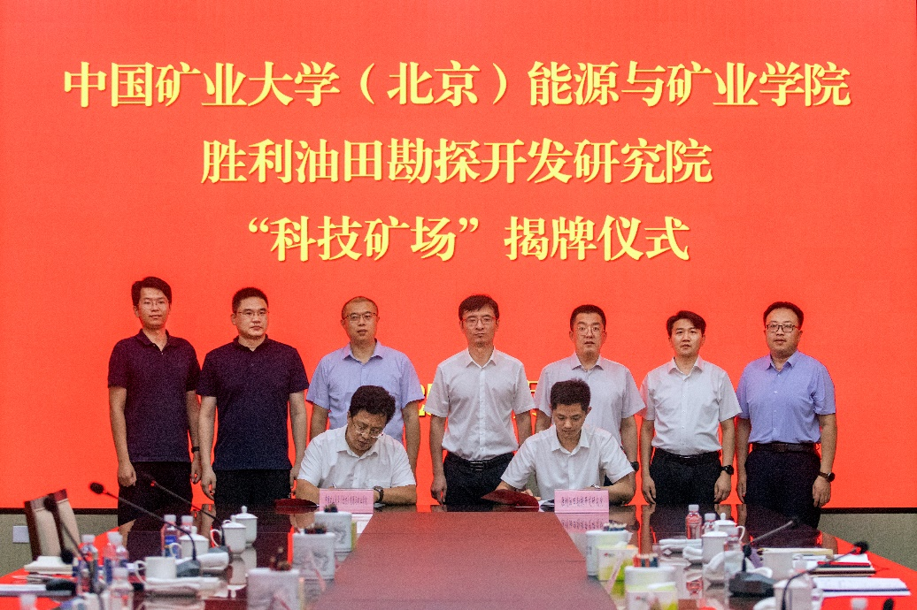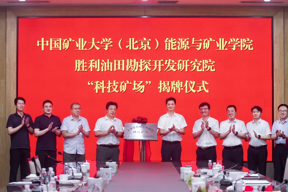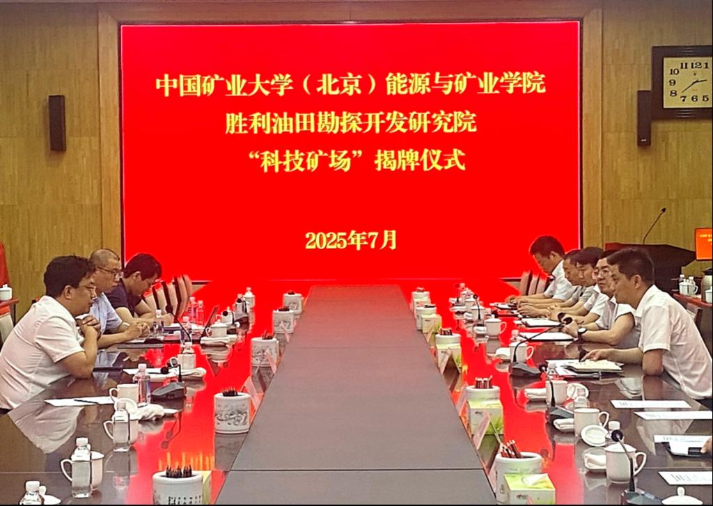 本网讯 为深入贯彻落实教育部关于“访企拓岗促就业”专项行动的部署要求,深化校企合作,拓展新工科实践平台,助力毕业生高质量就业,7月17日下午,能源与矿业学院院长杨胜利教授带队,能源科学与工程系主任郝宪杰教授、系副主任张洪伟副教授、朱广沛老师随行,赴中国石化胜利油田勘探开发研究院走访调研,并举行“科技矿场”大学生创新实践基地揭牌仪式。胜利油田勘探开发研究院曹小朋院长主持会议。研究院吕琦副院长、综合管理部肖琨主任、人力资源(组织)部朱道远主任、项目管理部王东方经理、岩心管理室高祥成经理、地层古生物实验室滕建彬经理、开发试验室张红欣经理、气驱试验室郑文宽经理等相关部门负责人出席会议并一同座谈。双方围绕科技创新、人才培养、实践基地建设等议题展开深入交流,并共同为“科技矿场”大学生创新实践基地揭牌,标志着校企合作迈入新阶段。