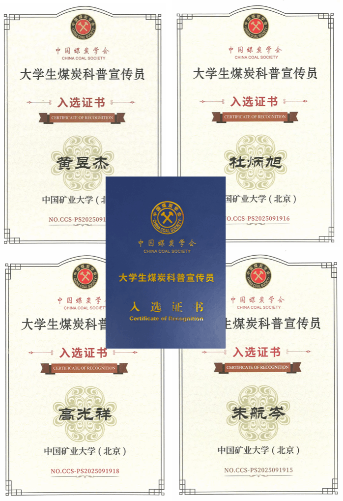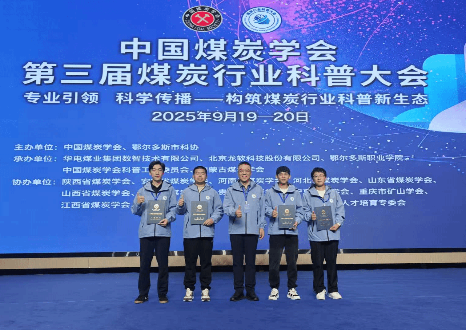 本网讯 2025年9月19日至20日,以“专业引领 科学传播——构筑煤炭行业科普新生态”为主题的“第三届煤炭行业科普大会”在内蒙古鄂尔多斯举办,由我院杨胜利、李良晖指导的智能采矿工程专业本科生黄昱杰、高光祥、朱航岑、杜炳旭等4人,荣获“中国煤炭学会大学生煤炭科普宣传员”称号并受邀参会,其共同完成的科普视频作品《矿山一体化二氧化碳零排放产业》成功入选大会展示环节。大会由中国煤炭学会、鄂尔多斯市科协联合主办。