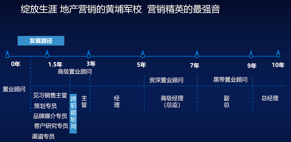 A:我们甄选优秀毕业生,通过3-4年的培养其为优秀的地产行业营销管理人才。大部分绽放在1到2个月内,会独立承担销售任务,实现客户成交;12个月内成为营销熟手,掌握营销流程和关键知识技能,优秀绽放会在18到24个月内成长为营销主管。 同时我们也提供跨职能轮岗的机会,全方位挖掘每个人的潜在可能性!
