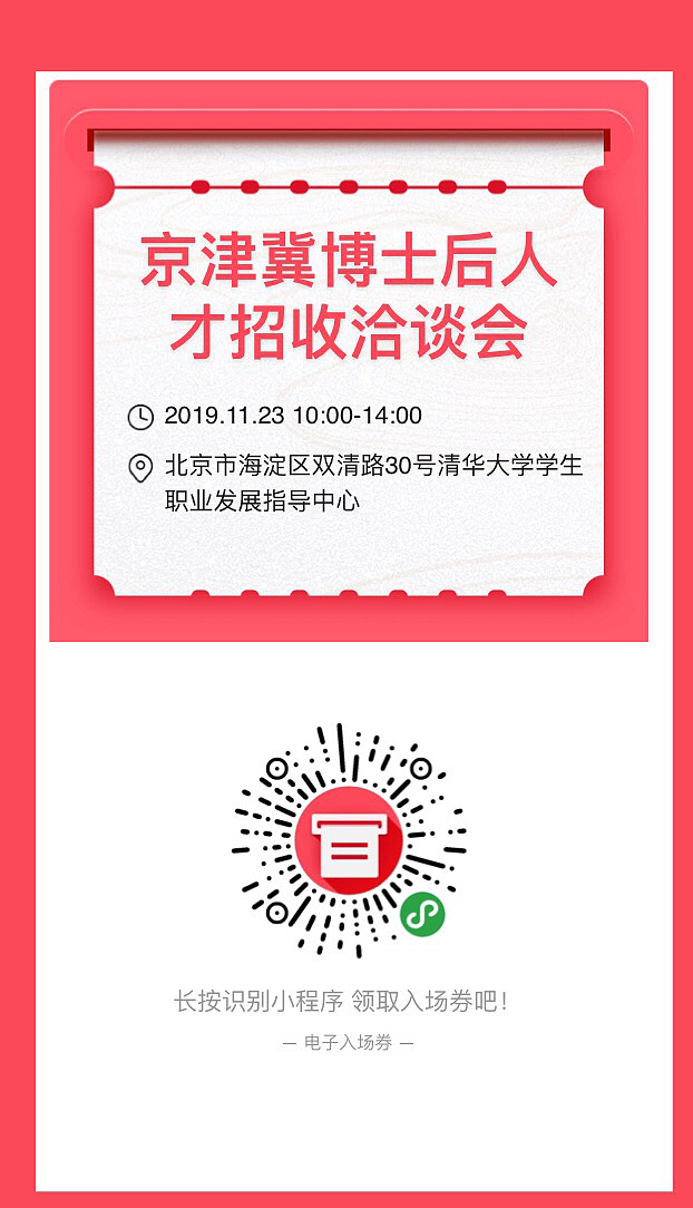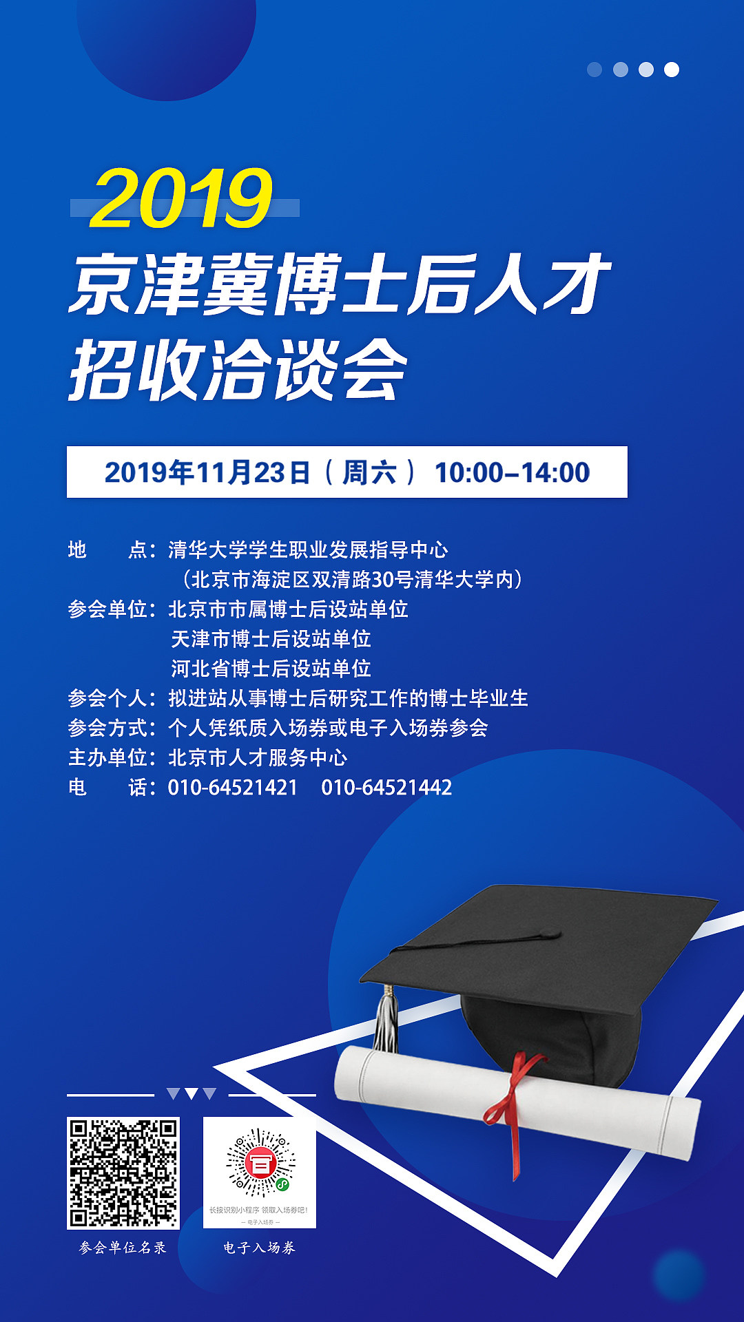 为贯彻习近平新时代中国特色社会主义思想,落实京津冀协同发展战略及北京建设全国科技创新中心部署要求,扎实推进北京市高层次人才队伍建设,更好提升服务高层次人才能力,北京市人才服务中心定于2019年11月23日(周六),在清华大学举办“2019京津冀博士后人才招收洽谈会”,欢迎应届及往届博士毕业生参会洽谈。参会有关事宜如下: