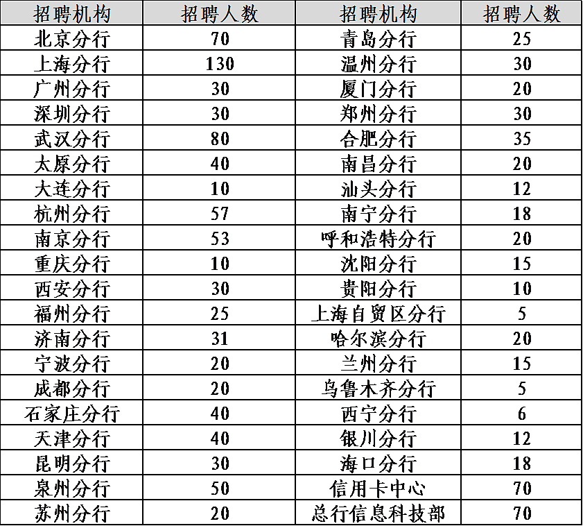 北京分行,上海分行,广州分行,深圳分行,武汉分行,太原分行,大连分行,杭州分行,南京分行,重庆分行,西安分行,福州分行,济南分行,宁波分行,成都分行,石家庄分行,天津分行,昆明分行,泉州分行,苏州分行,青岛分行,温州分行,厦门分行,郑州分行,合肥分行,南昌分行,汕头分行,南宁分行,呼和浩特分行,沉阳分行,贵阳分行,上海自贸试验分割行,哈尔滨分行,兰州分行,乌鲁木齐分行,西宁分行,银川分行,海口分行,信用卡中心,总行信息科技部。