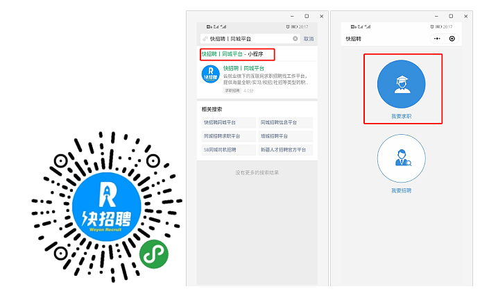 2、应聘人员:硕士、博士人才通过微信小程序“快招聘同城平台”注册简历可免费视频应聘。