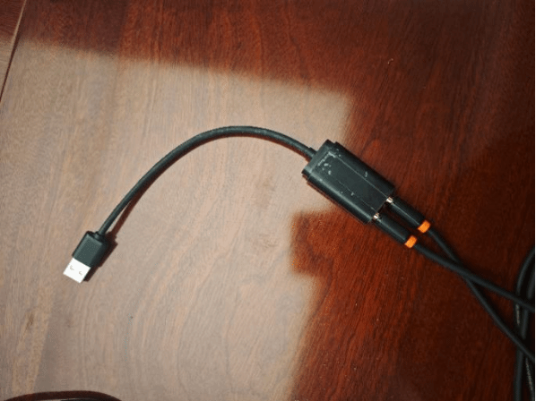 步骤2:将数据线按照红色及白色对应插入,黑色插入笔记本电脑音频孔。